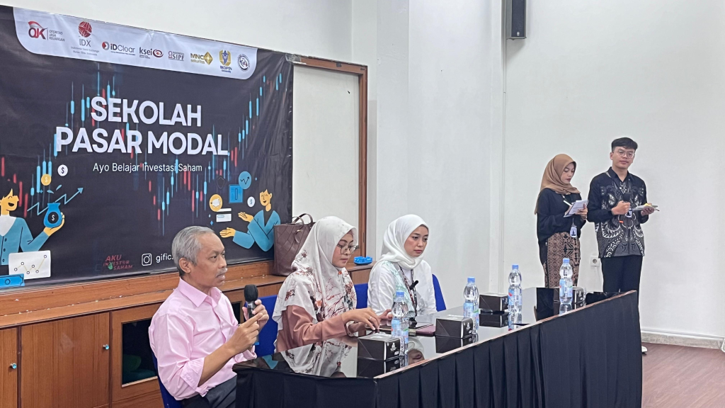 Kegiatan ini menghadirkan dua narasumber utama dari industri pasar modal, yaitu Ibu Sri Herlinawati perwakilan dari IDX Jawa Barat dan Ibu Caisaria Kartono Putri MNC Sekuritas Cabang Bandung. Para pembicara menyampaikan materi seputar pengenalan pasar modal, instrumen investasi seperti saham, obligasi, dan reksa dana, serta langkah-langkah membuka rekening efek dan melakukan transaksi secara online.